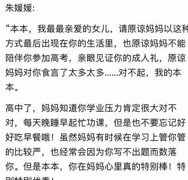 对于丈夫她有太多的委屈,而对于女儿她更是有着说不清的不舍跟遗憾,那封告别信里,她称呼女儿为本本,这是他们起的小名。 希望她能“本本分分做人,本本分分生活”,名字里寄托着他们对女儿的期盼和宠爱,朱媛媛也以这样最温柔的方式做着最悲伤的告别。