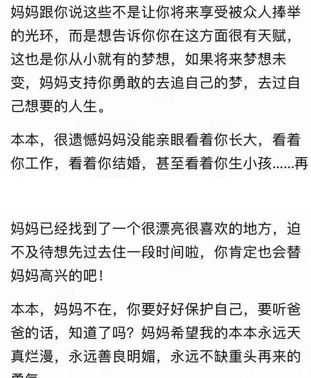 但对于朱媛媛自己,她只能把所有想说的话简短的概括在这封信里,其实她比谁都要难过都要害怕,即便这样她还是不忍心在信里对女儿说自己离世这样的话。 字里行间透露着的全是她身为母亲对女儿的关爱和不舍,看到这些话,我一时难受到不知该如何表达,本本才17岁她要承受和面临的要比我们多得多。